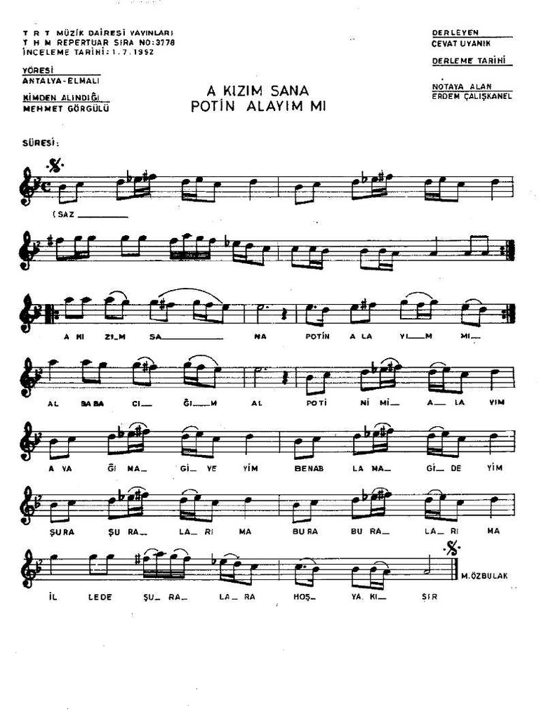 a kizim sana potin alayim mi turku notalari